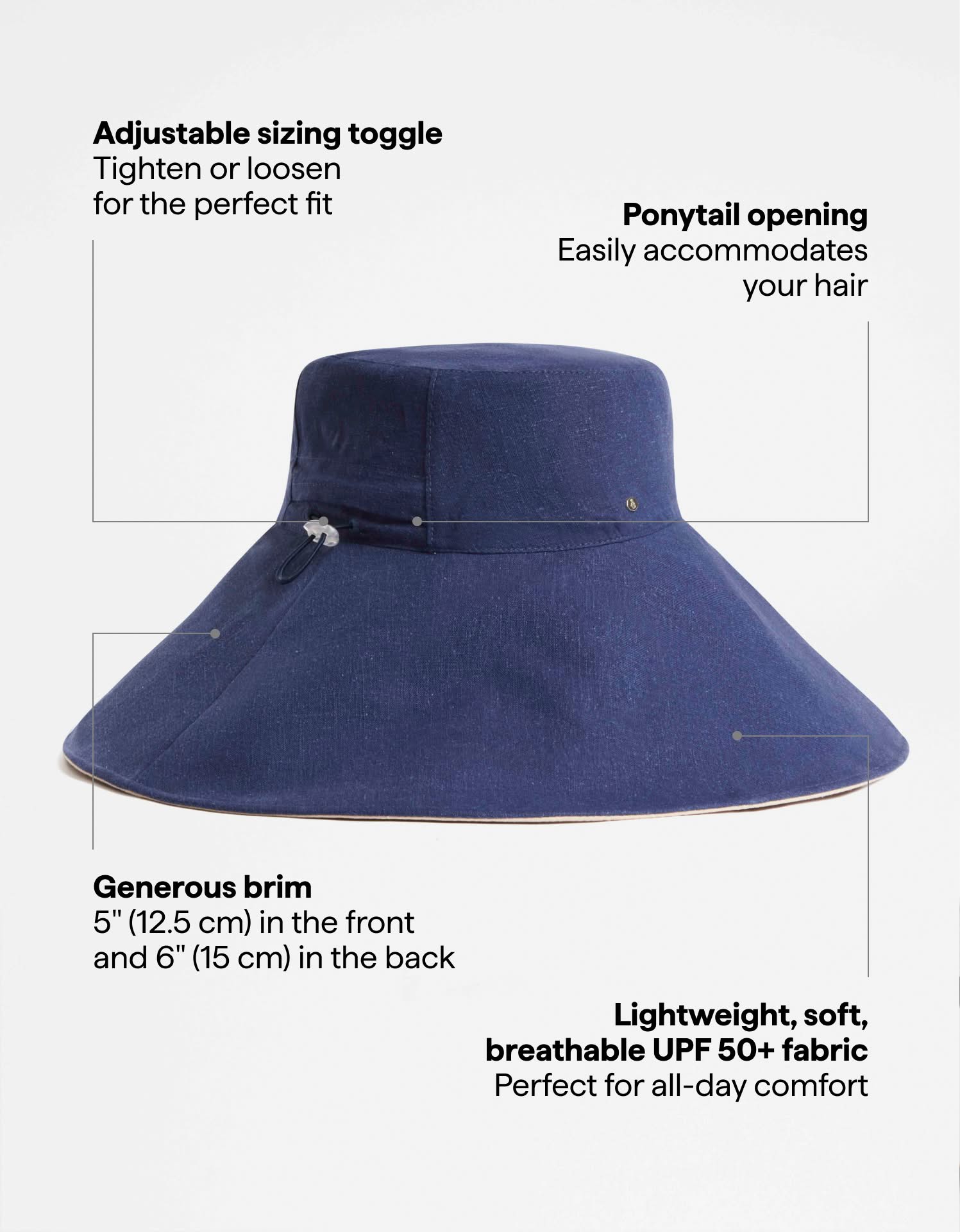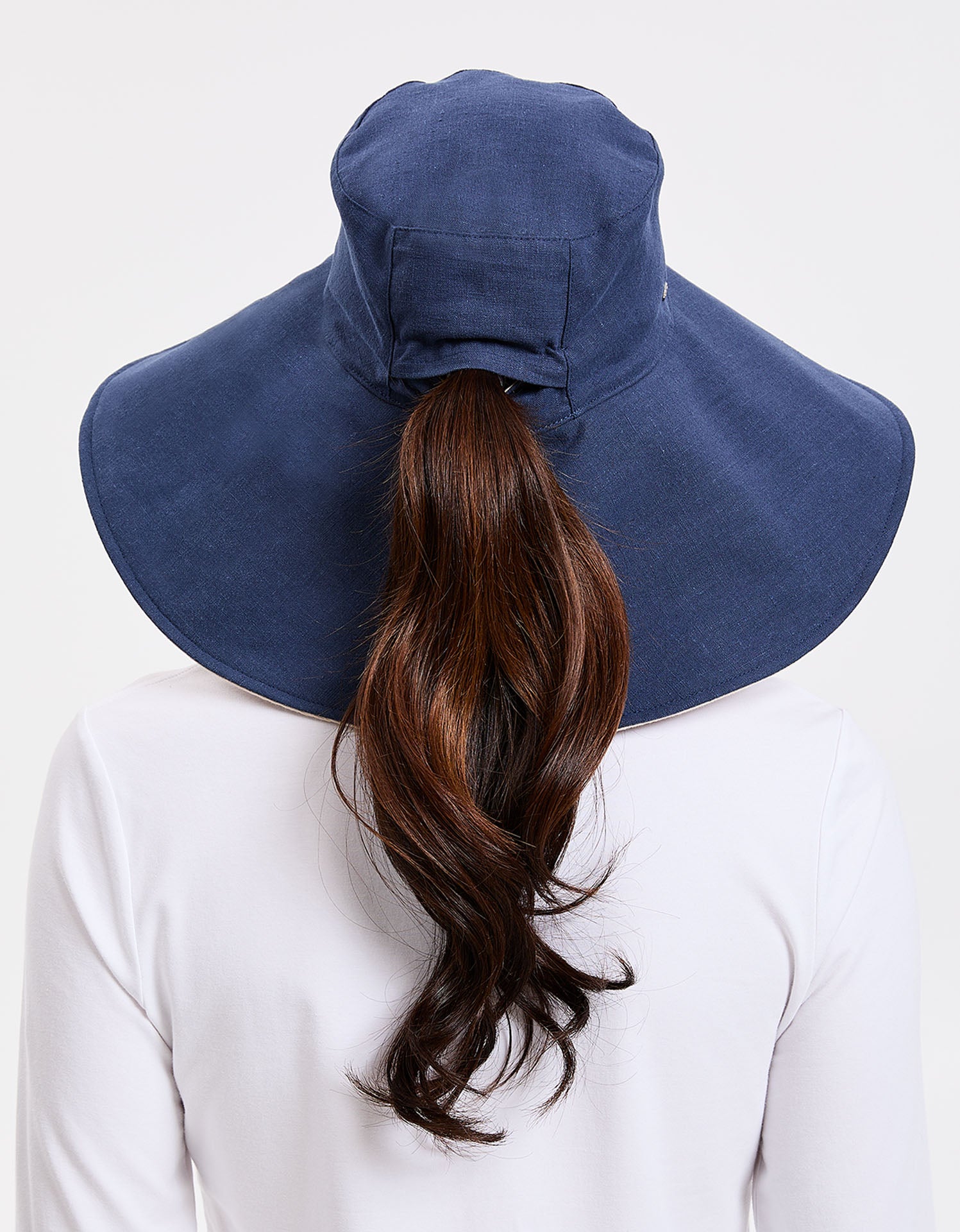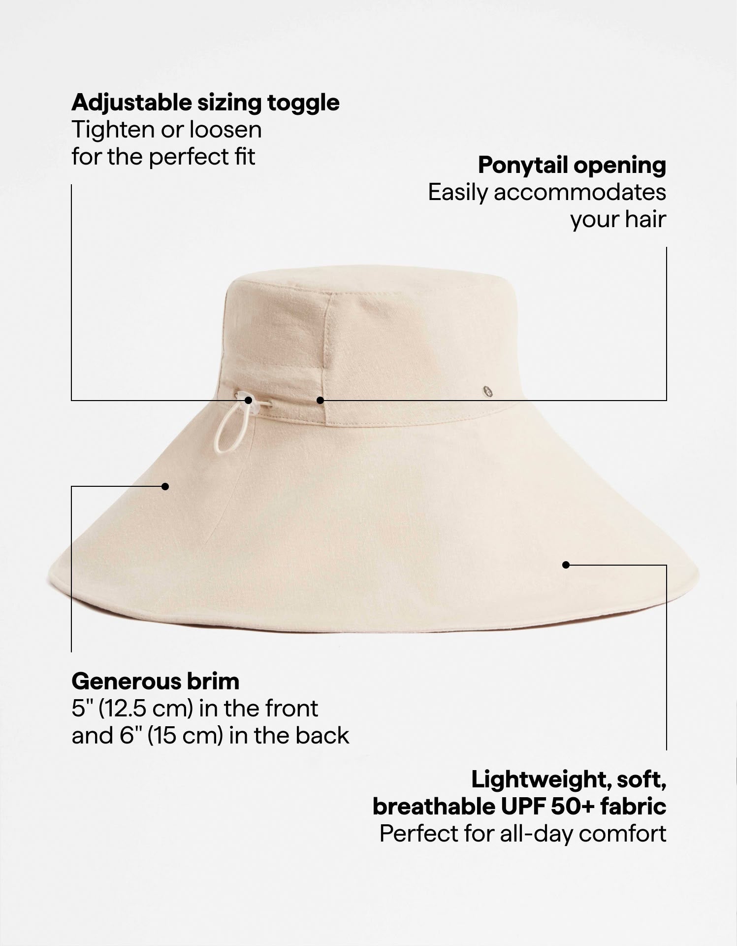 Ultra Wide Cotton Linen Sun Hat with adjustable fit, and ponytail opening