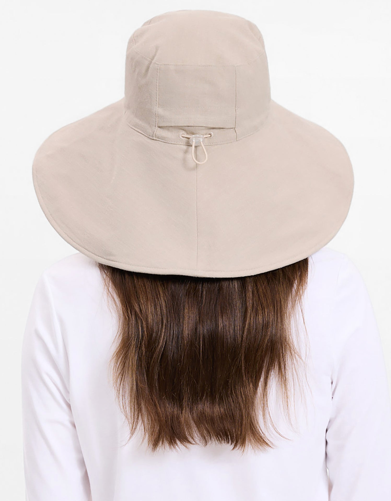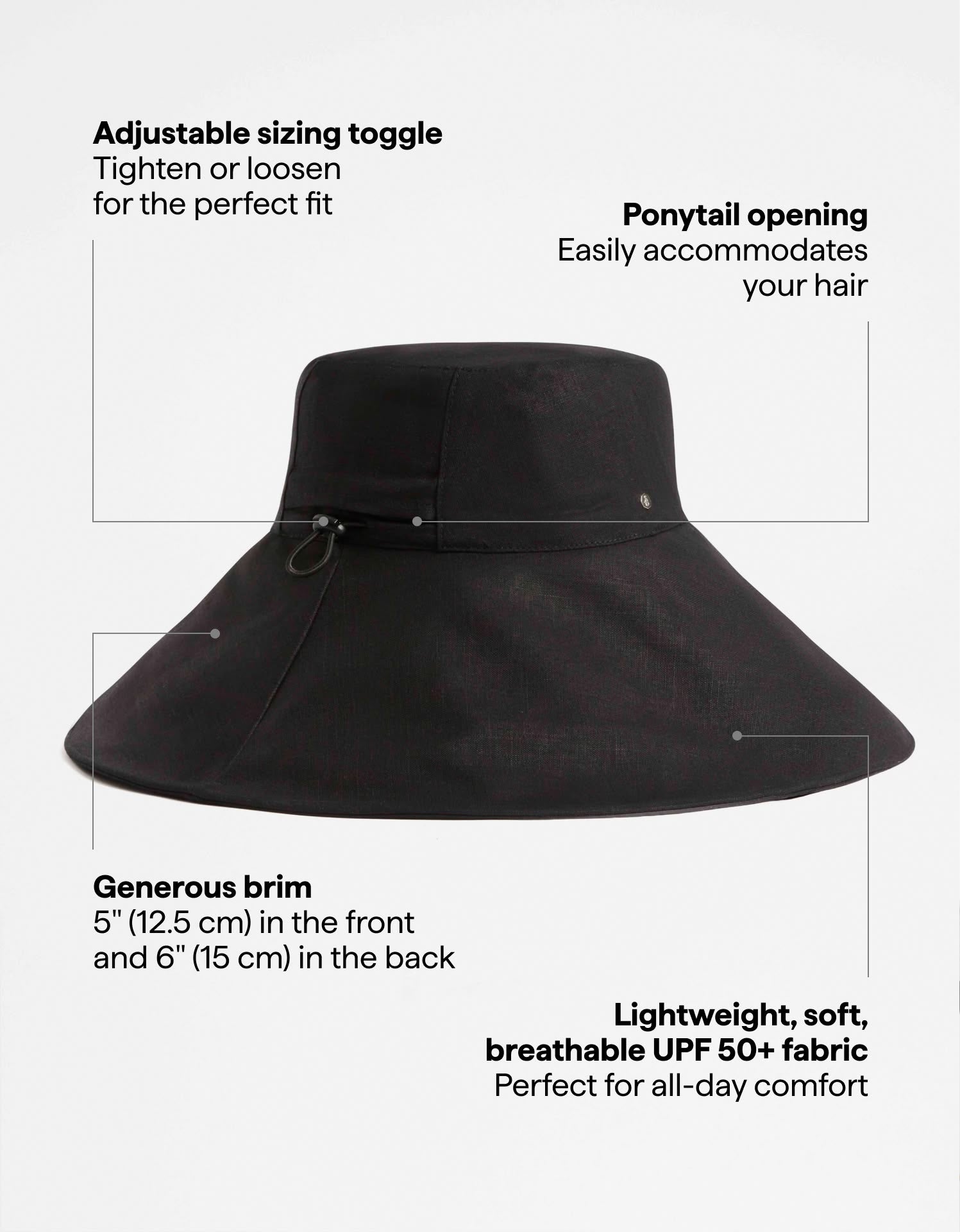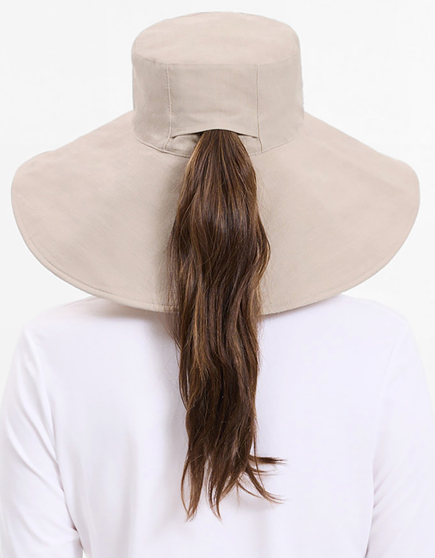 Ultra Wide Cotton Linen Sun Hat with adjustable fit, and ponytail opening